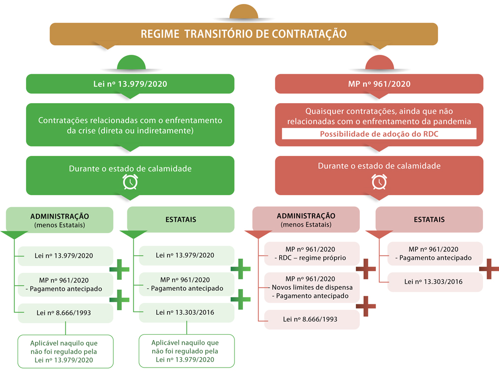 Além dos regimes ordinários de contratação – Lei nº 8.666/93 e Lei nº 13.303/16 – a Lei nº 13.979/20, que trata das contratações direta ou indiretamente relacionadas ao enfrentamento da Pandemia – COVID-19 e, mais recentemente, a Medida Provisória nº 961/2020. Esta última que, além de aumentar os limites legais da dispensa em razão do valor previstos na Lei nº 8.666/93, autorizou a realização de pagamentos antecipados, bem como autorizou a adoção do RDC – Regime Diferenciado de Contratações para quaisquer contratações durante o período da calamidade pública.